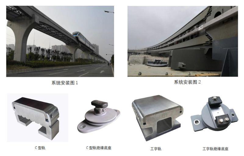 跨座式单轨钢铝复合接触轨系统产品安装于轨道梁两侧, 通过集电靴向电力机车提供电能。该系统产品具有使用寿命长、维护量小、安装操作简单等优点, 尤其适用于小限界安装使用。