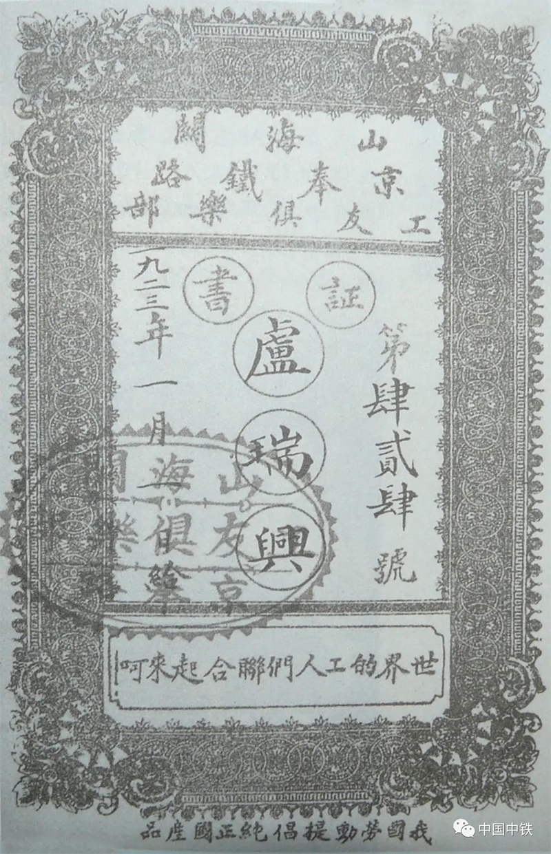 山海关京奉铁路工友俱乐部证书